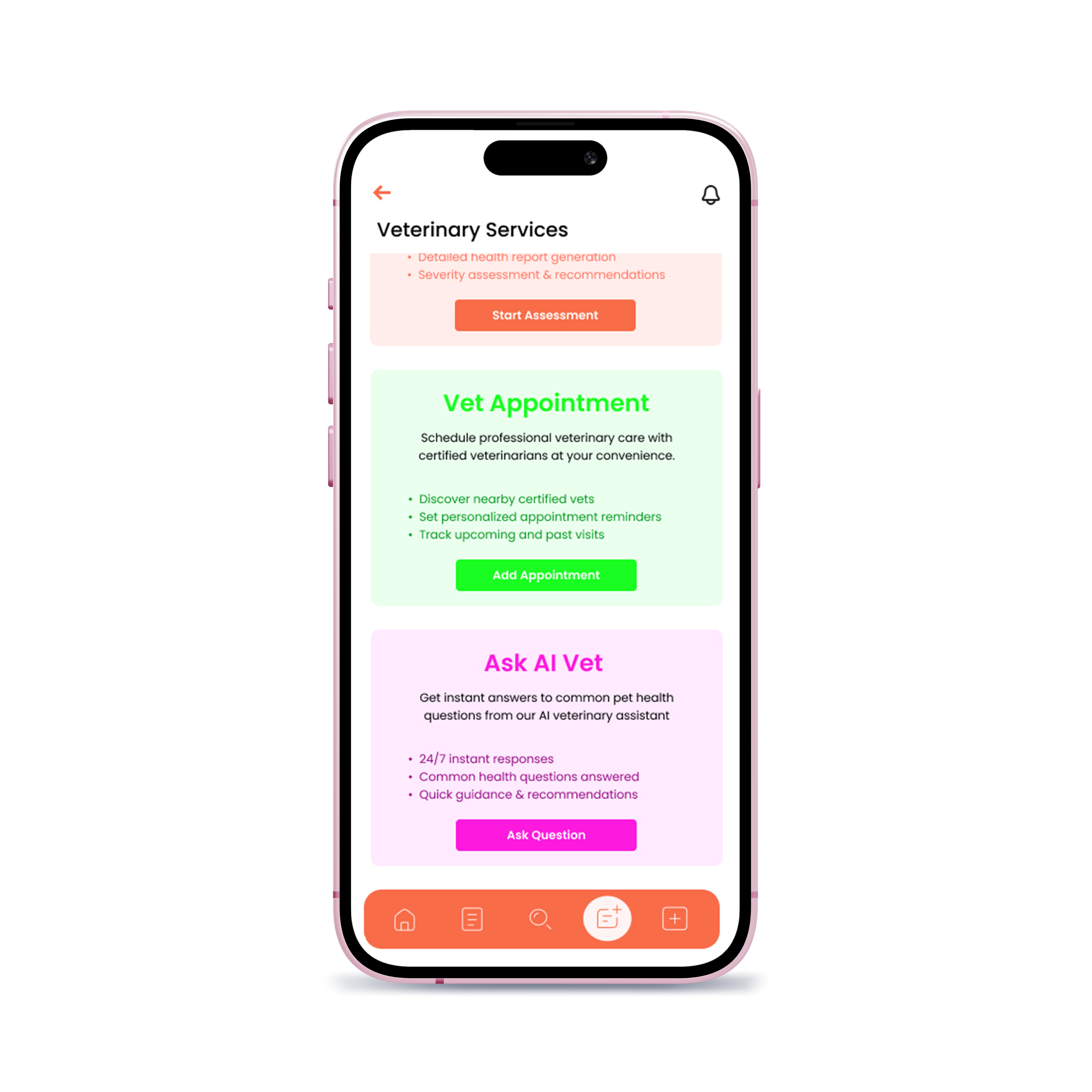 • Personalized Recommendations: Get tailored suggestions based on your pet’s profile, symptoms, and needs for more accurate and relevant care.