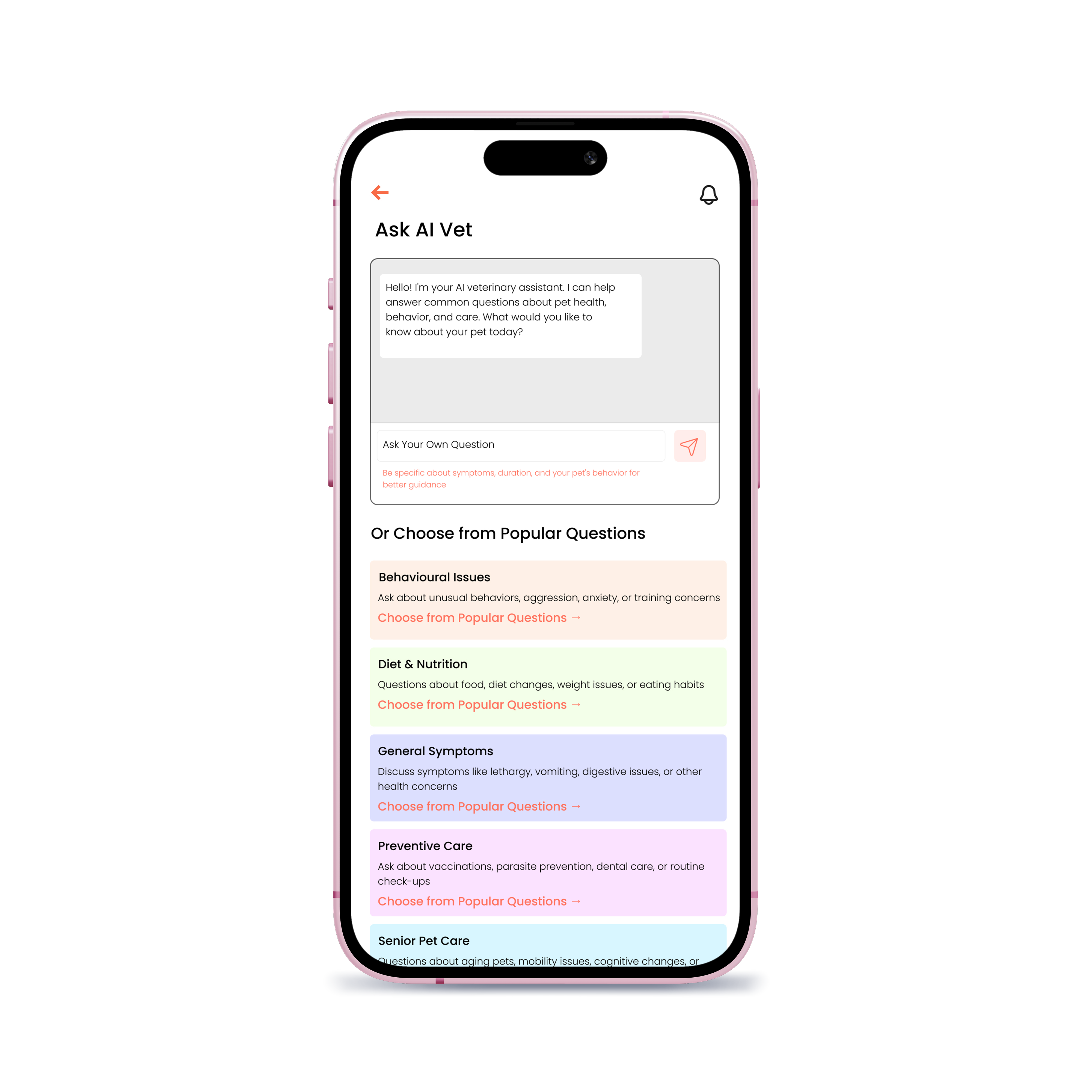 You can ask about symptoms, nutrition, grooming, behavior, preventive care, and general health concerns. The AI is best suited for everyday pet care queries and quick advice rather than complex diagnoses.