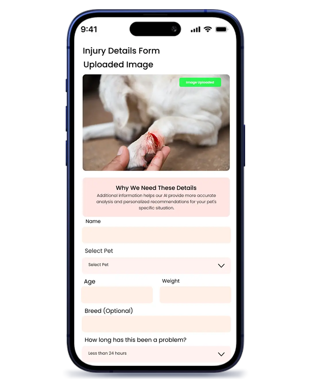 With our AI-powered Pet Injury Scanner, you can upload a photo of your pet’s injury or health concern and receive instant insights within seconds.