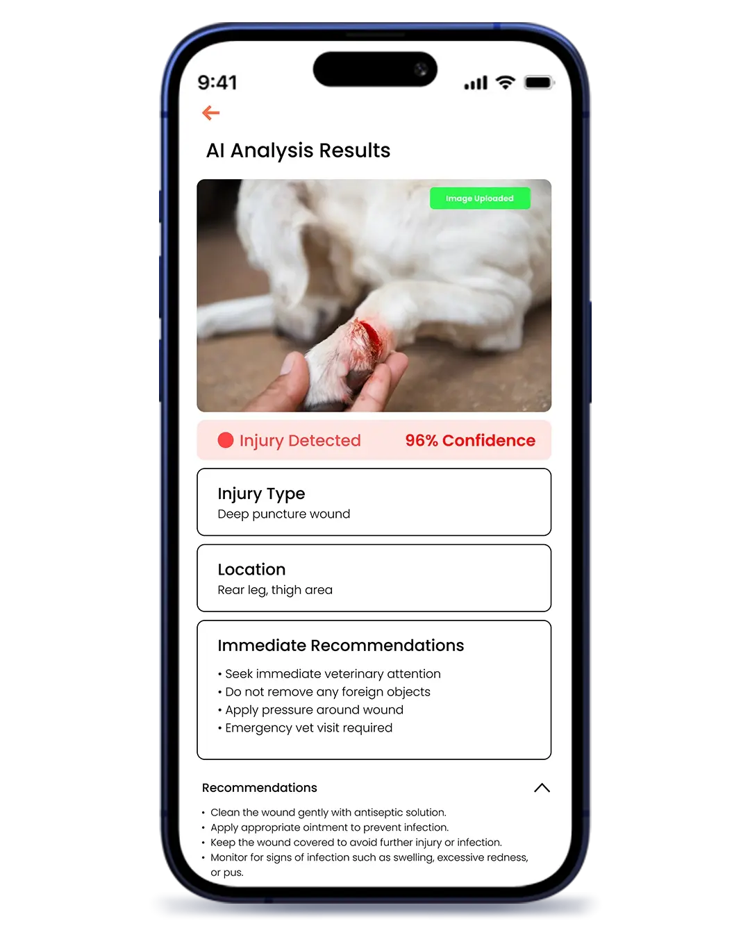 If Pet-Care AI Injury Scanner indicates a potential emergency or severe Pet Injuries, you should seek immediate veterinary care for proper diagnosis and treatment.